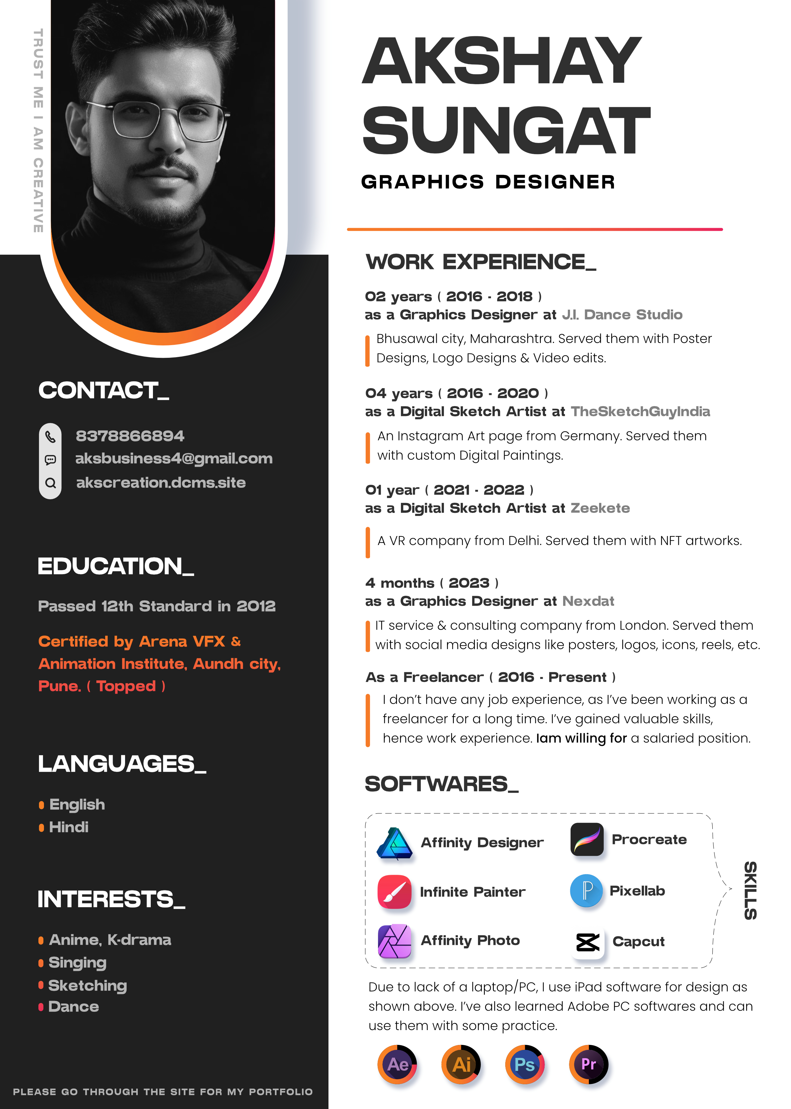 Now, I'm excited to embark on a new chapter with my own brand, AKS Creations (Akshay Sungat Creations). I'm passionate about helping others bring their visions to life through design, and I'm always looking for new and exciting projects to collaborate on.
